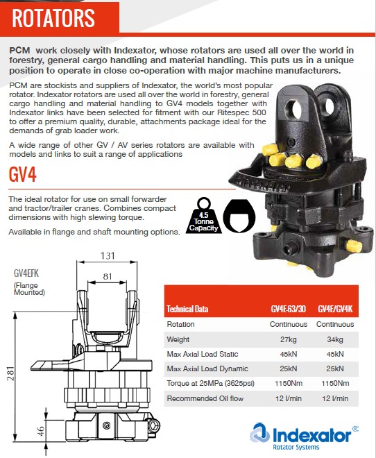 With it’s head office and manufacturing plant based in Sweden, the Indexator Rotator is best known for its use in forestry applications but also for general cargo handling and material handling. PCM have selected the GV4 model for fitment with our Ritespec 500 grab buckets to offer a premium quality, durable attachment package which is ideal for the demands of grab loader work.