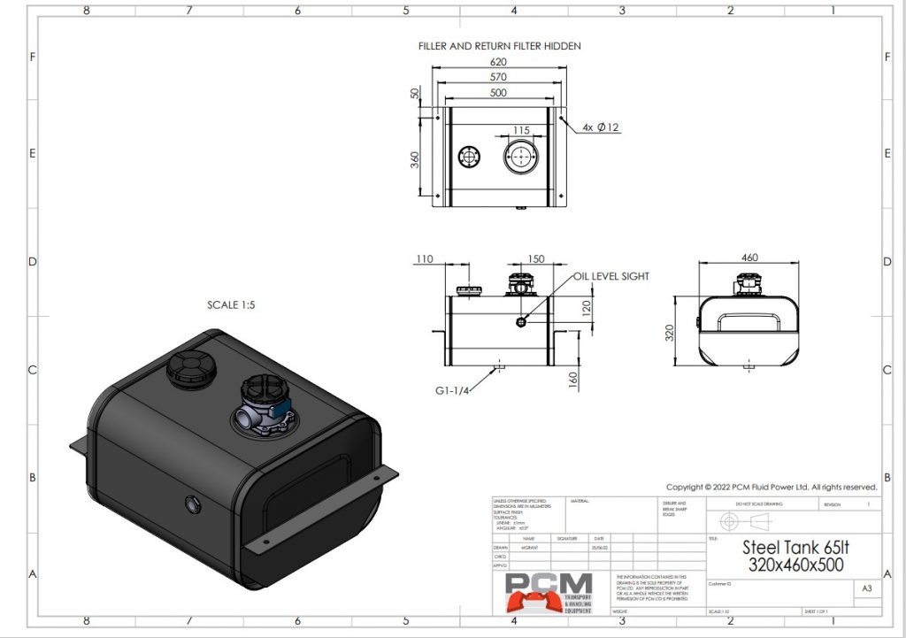 Tank supplied complete with sight level gauge, filler breather, return filter assy, rubbers, straps and bracket.